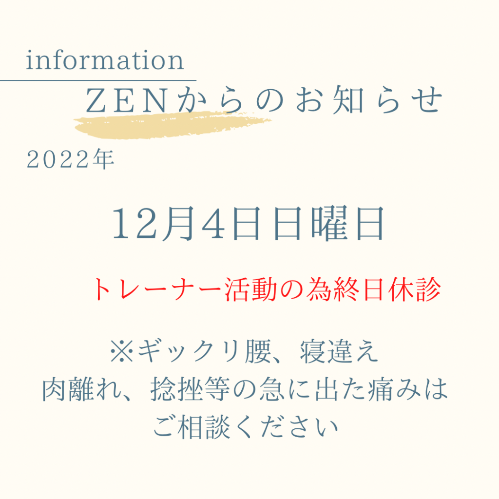 皆様こんにちは、名古屋市緑区で腰痛、肩こり、スポーツ障害ならZENにお任せ。